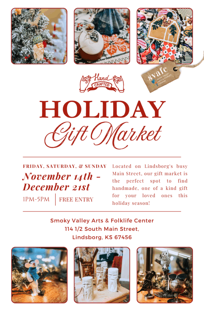 The Smoky Valley Arts & Folklife Center in Lindsborg invites you to experience the spirit of the season at its Handcrafted Holiday Gift Market, running November 14 through December 21, 2025. The market will be open Fridays, Saturdays, and Sundays from 1 to 5 p.m. at the Smoky Valley Arts & Folklife Center, 114 ½ South Main Street in downtown Lindsborg, Kansas.